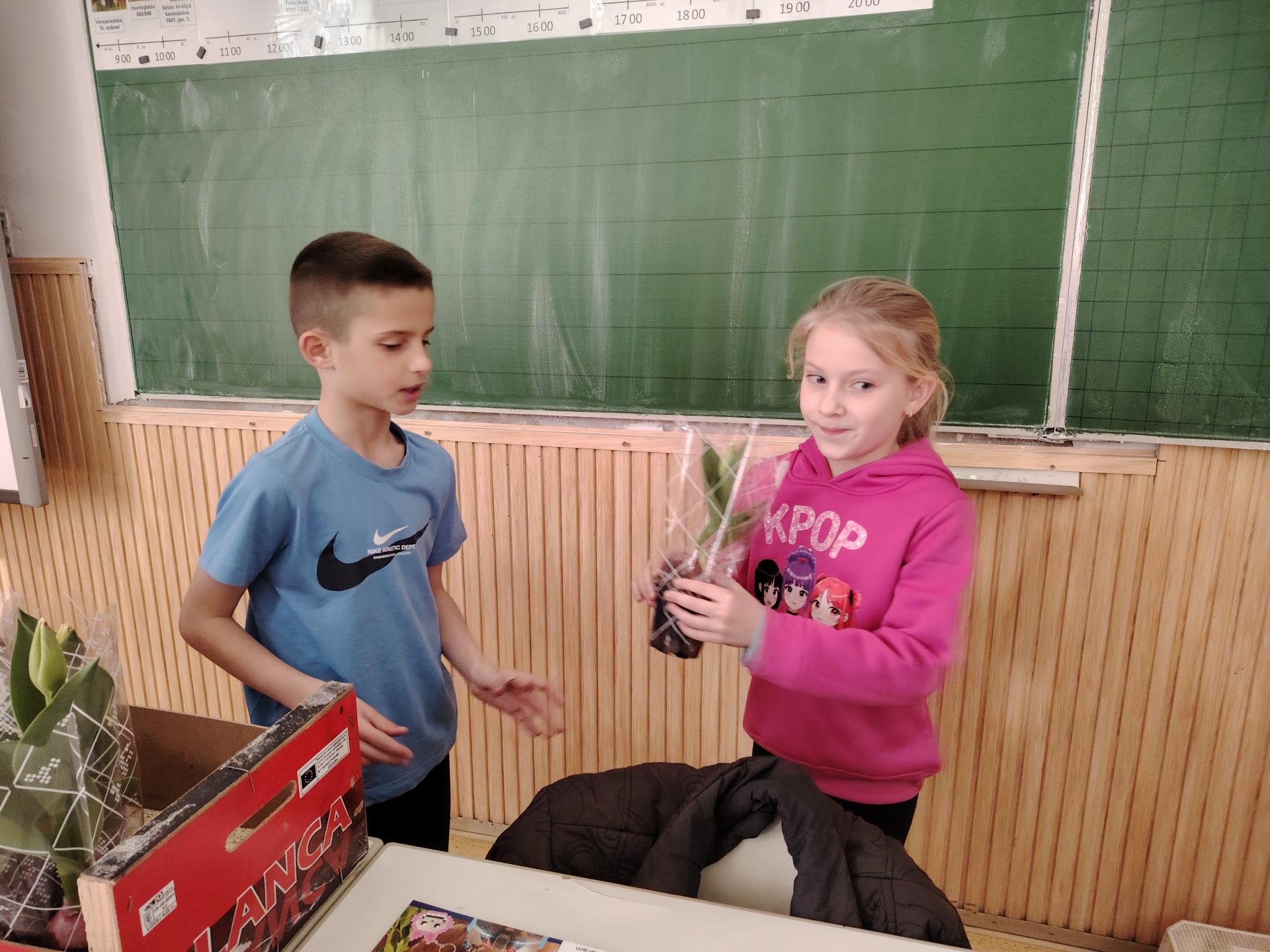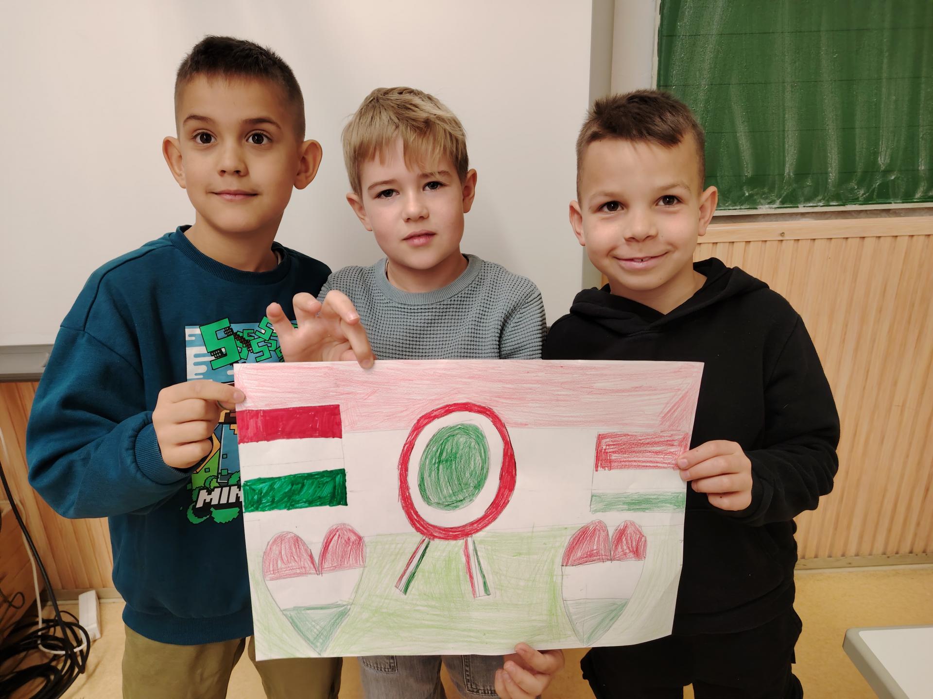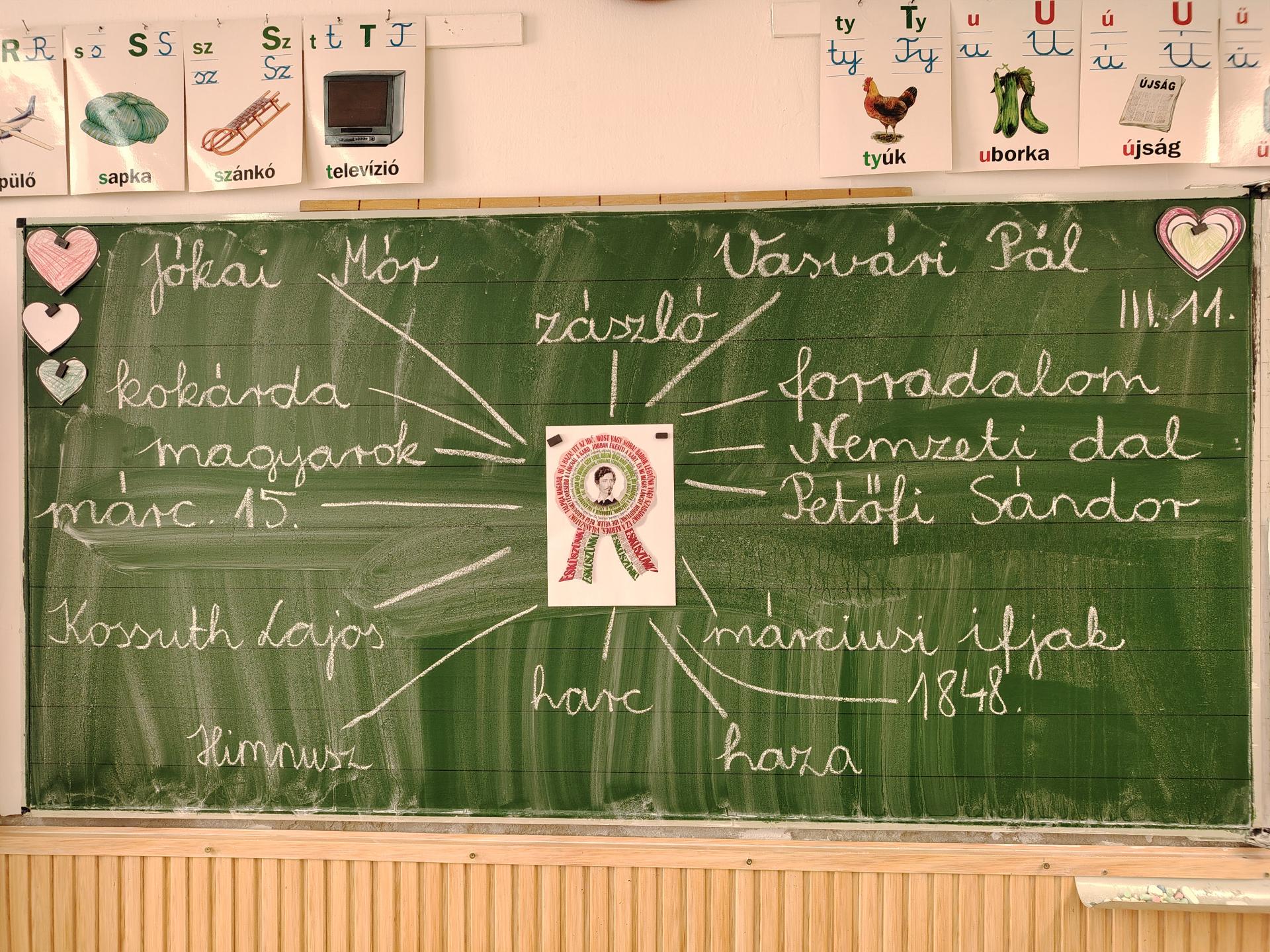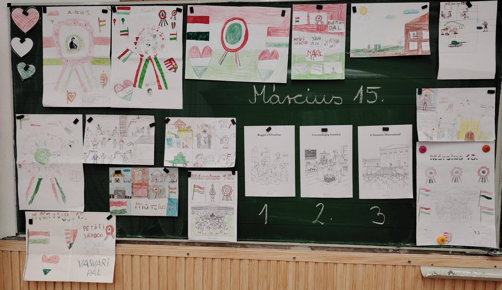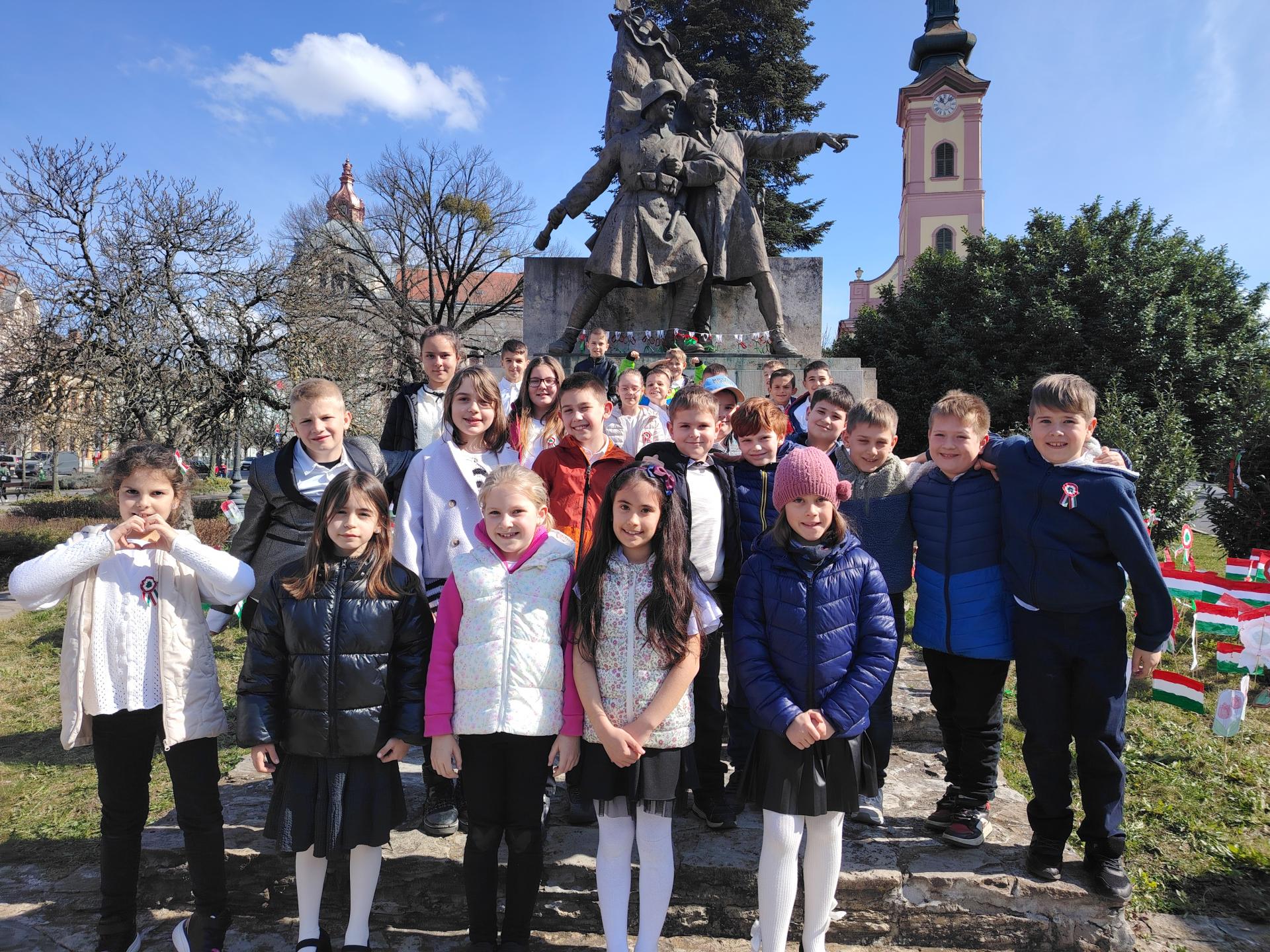2.Kiemelt téma minden egyes évben a március 15-i nemzeti ünnepünk. Mindig egy egész hetet szentelünk rá hagyományosan. Ezen a héten minden egyes órán ezt a témát dolgoztuk fel. S idén is, mint minden évben a hét zárásaként elmentünk a Petőfi szoborhoz, elszavaltuk a Nemzeti dalt, majd elhelyeztük a megemlékezés zászlóit, kokárdáit. A hazaszeretet nagyon fontos boldogságfokozó érzés.