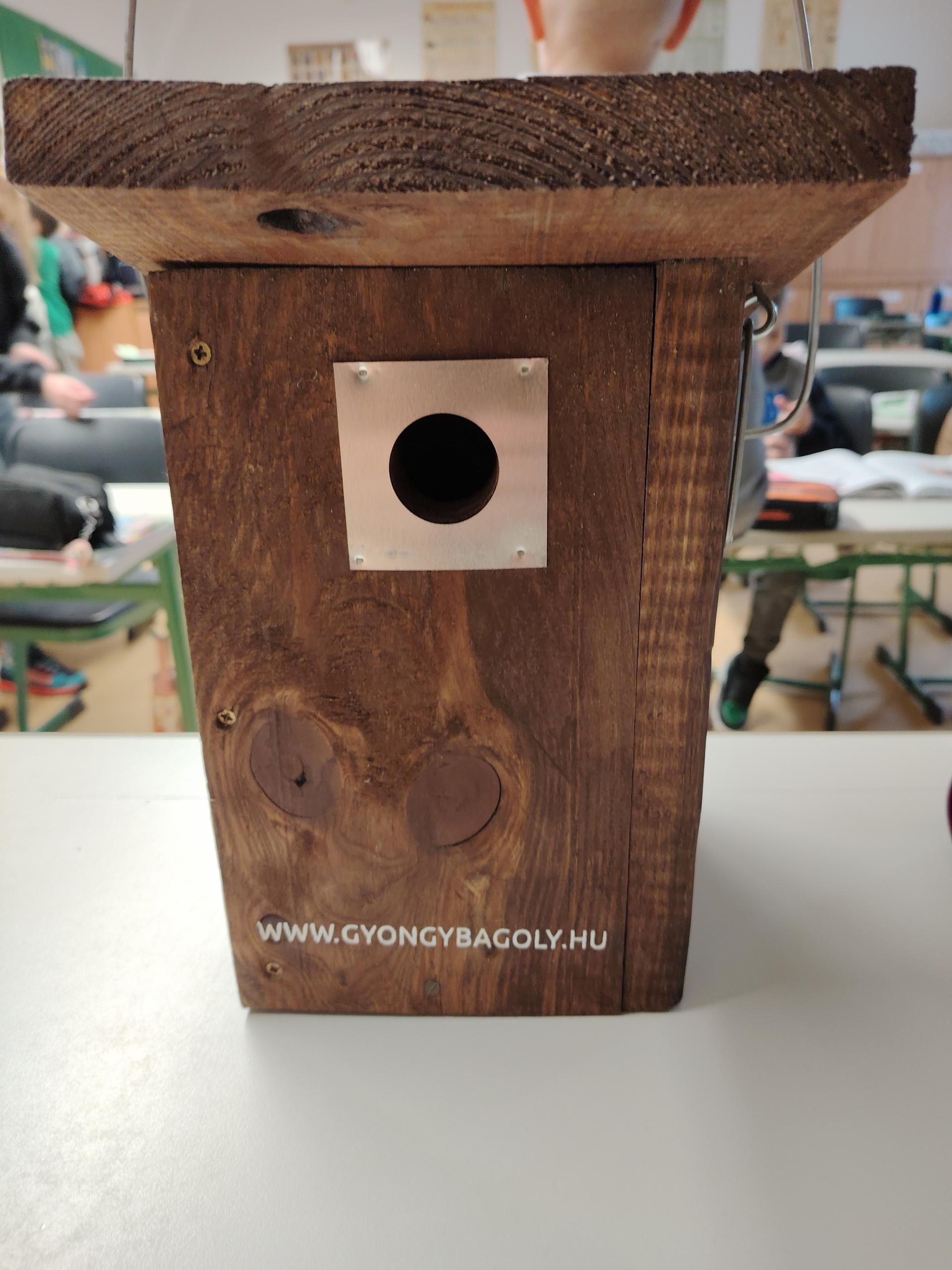 Ajándékba kaptak egy énekesmadár keltető odút, melyet az iskola udvarán fogunk elhelyezni, hogy figyelemmel kísérhessük a madarak életét.