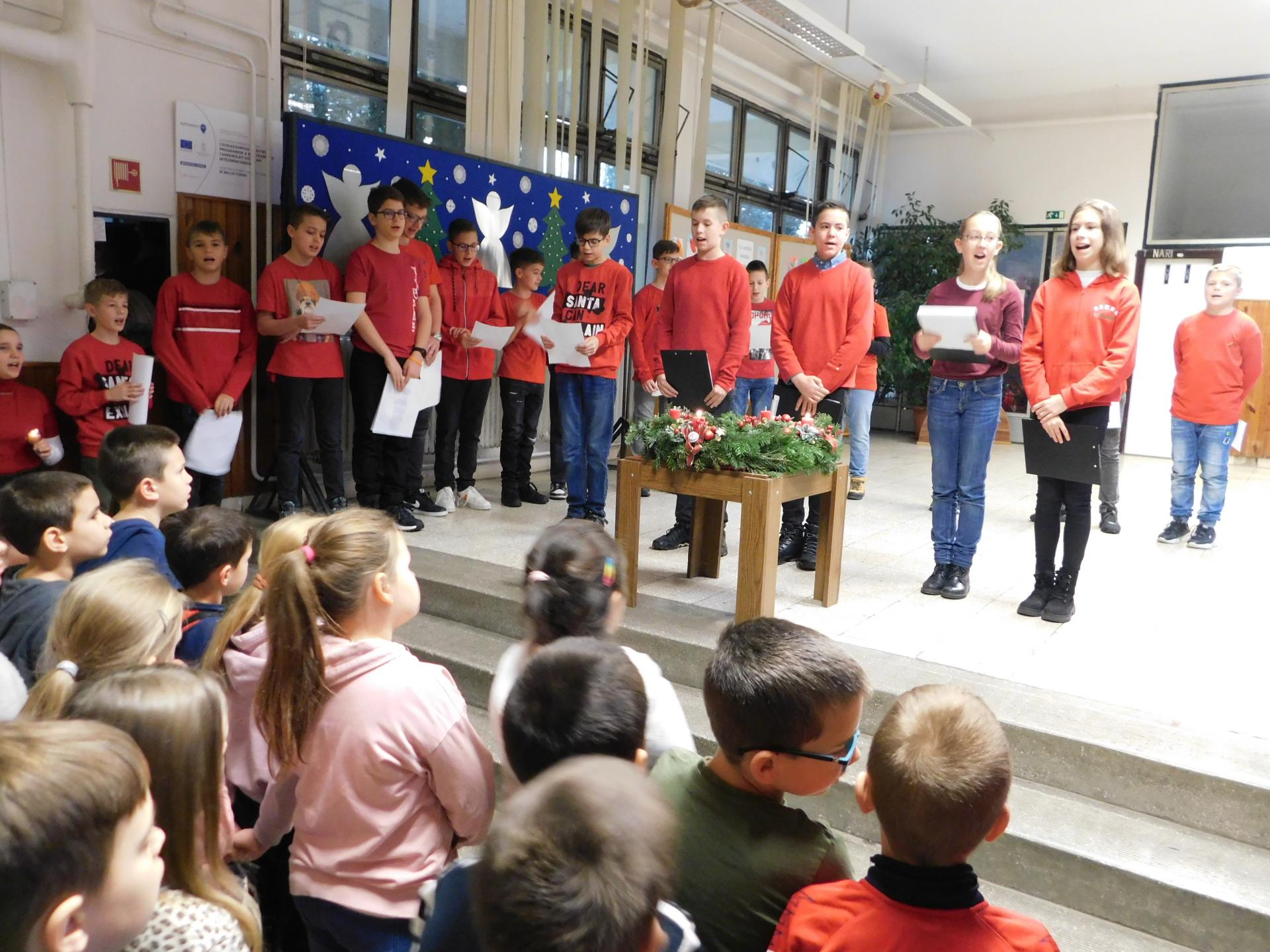 A 6. évfolyamos tanulók készültek kis műsorral. A verseket Cserfő Luca (6.A), Hegedüs Hanna (6.B), Bencze Balázs (6.B), Horváth Fülöp (6.A) és Kocsis Dániel (6.A) mondták el. Együtt énekeltük el az Adventi hírnök című dalt.