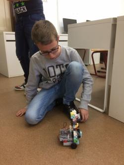 A szakköri foglalkozás keretében a gyerekek megismerték a grafikus programozási környezetet, melyben a fő szerep az algoritmikus gondolkodásé, majd a DC motorok programozásával az egyenes irányú mozgás, a kanyarodás, az íven haladás, a helyben fordulás is programozásra kerültek. A tervezés és a megvalósítás során is együttműködve, saját ötleteiket megvalósítva egyre sokrétűbb mozgásra lettek képesek a saját építésű kis robotok.