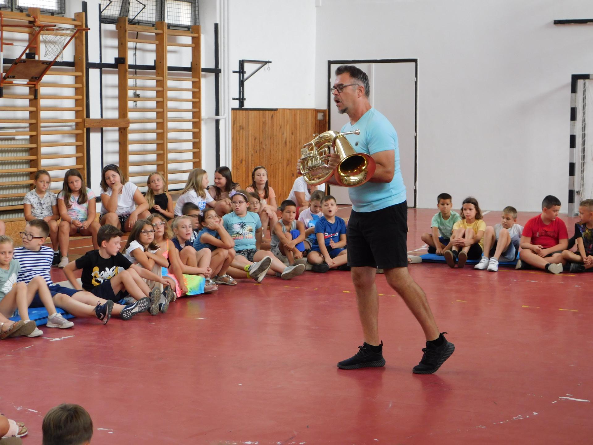 Megmutatta, hogyan lehet megszólaltatni a rézfúvós hangszereket, és bemutatta a hangszercsalád tagjait a gyerekeknek.